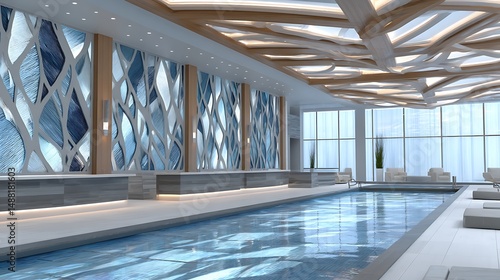 Modern Indoor Pool with Artistic Wall Designs and Elegant Wood Ceiling Details