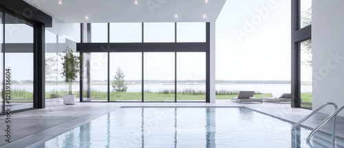 Modern indoor pool with large windows overlooking serene lake view