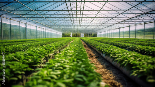 Modern industrial greenhouse with a vegetable plantation, generative ai