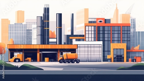 Modern industrial landscape featuring a construction site, trucks, and buildings with a vibrant color palette.