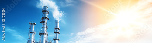 Modern industrial landscape with smokestacks and bright sunlight, showcasing energy and environmental themes.