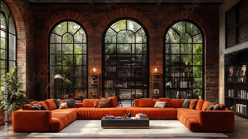 Modern Industrial Living Room with Terracotta Sectional Sofa. Concept of Cozy, Stylish, and Spacious.