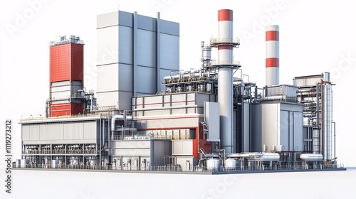 Modern industrial power plant with red and white structures, pipes, and chimneys against a white background. Generative ai