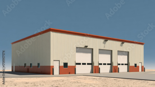 Modern Industrial Structure in Open Area: An attractive and contemporary industrial building with a design that blends functionality and aesthetics. The architectural features.