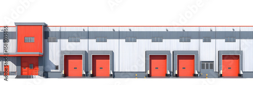 Modern industrial warehouse with red loading docks and clear blue sky in the background, ideal for logistics