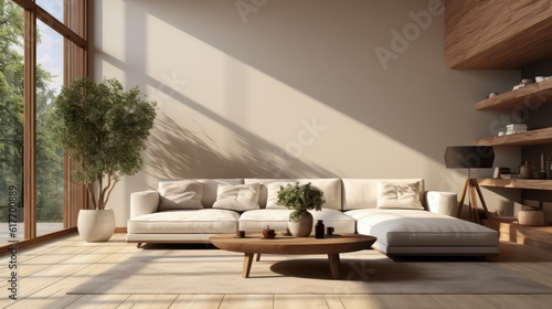 Modern interior design of living room with white sofa, coffee table, soft stucco wall. Created with generative AI.