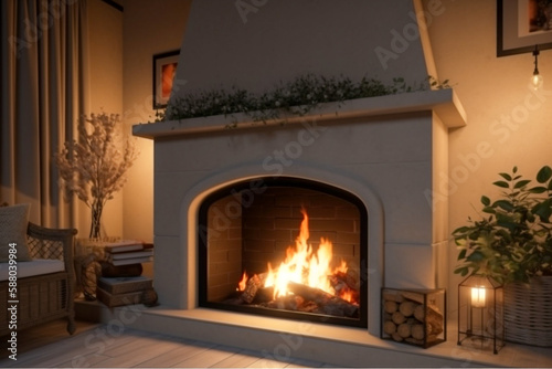 Modern interior design of the living room with fireplace. Super photo realistic background, generative ai illustration