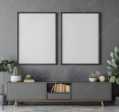 Modern interior design, two blank poster frames on cabinet with books and succulents nearby, grey wall background, minimalistic style, 3D rendering illustration in the style of minimalism