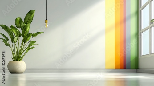 Modern Interior Design with Bright Colors, Plant, and Natural Light in a Minimalistic Space