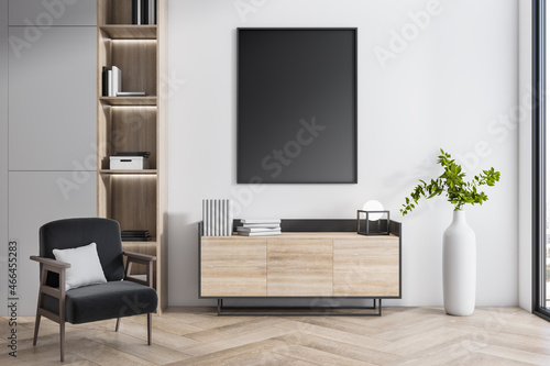 Modern interior with empty black mock up poster, wooden flooring, bookcase, armchair, decorative plant and window with city view. 3D Rendering.