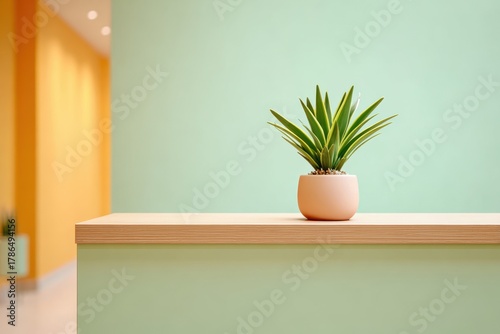 Modern interior with potted plant on wooden shelf