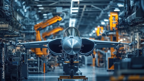 Modern jet fighter in a large hangar, surrounded by automated machinery
