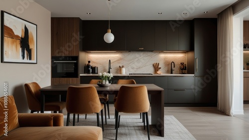 Modern kitchen and dining area with dark cabinetry, marble backsplash, and mustard yellow chairs.