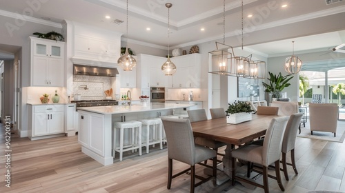 Modern Kitchen and Dining Room with White Cabinets and Hardwood Floors