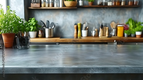 Modern Kitchen Countertop with Herbs and Utensils in Background