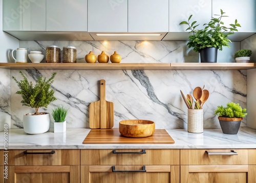 Modern Kitchen Design: Marble Backsplash, Hidden Storage, Wooden Cutting Board