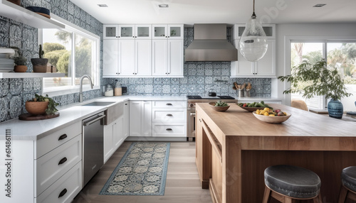 Modern kitchen design with luxury appliances, elegant wood cabinets, marble flooring generated by AI
