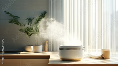 Modern Kitchen Environment with Steaming Rice Cooker and Plants