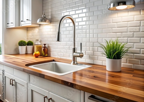 Modern kitchen faucet shines against a stunning backdrop of white cabinets, rich butcher block countertop, and crisp white subway tile backsplash, exuding warmth and sophistication.