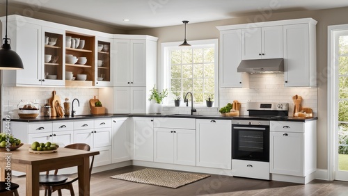 Modern kitchen features white cabinets, wood countertops, and a black sink. Natural light streams in, enhancing the minimalist, cozy ambiance.