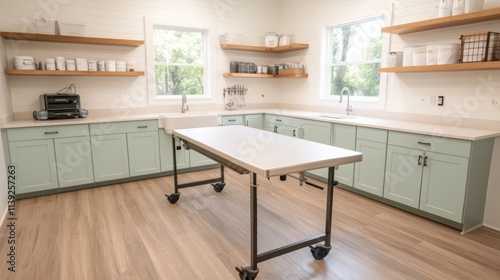 Modern kitchen interior design with bright light, mint green cabinetry, open shelving, and functional workspace for culinary activities and gatherings
