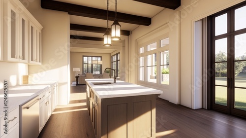 Modern kitchen interior featuring a spacious layout with natural light and elegant design elements