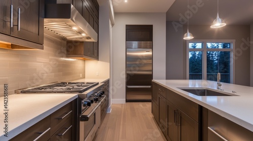 Modern kitchen interior featuring sleek cabinets, stainless steel appliances, and ambient lighting