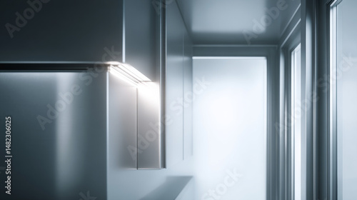 Modern kitchen interior featuring sleek design and natural light from windows.