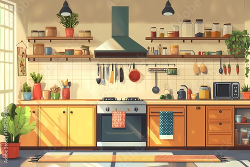 Modern Kitchen Interior Illustration. Cozy & Elegant Home Cooking Space with Decorative Furniture and Gourmet Equipment