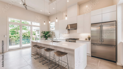 Modern Kitchen Interior with Stainless Steel Appliances and White Countertops
