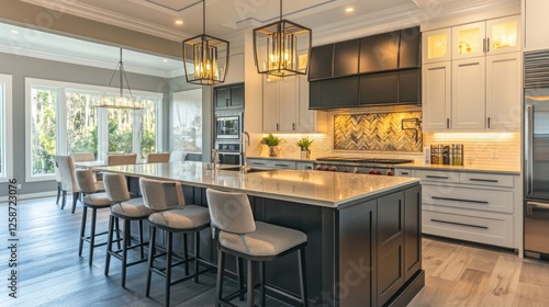 Modern kitchen island, dining area view, luxury home interior, lifestyle