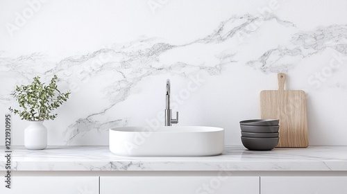 Modern kitchen sink, marble countertop, minimalist design, plants, wooden cutting board