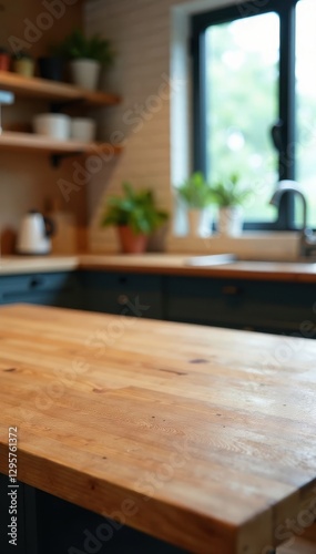 Modern kitchen table with empty wooden top and blurred bokeh background, clean bright minimalist modern kitchen interior, home decor