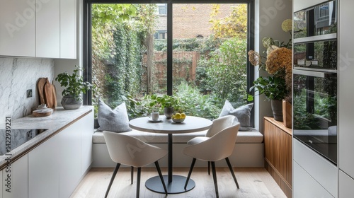 Modern kitchen with cozy dining area, lush garden view, and natural light