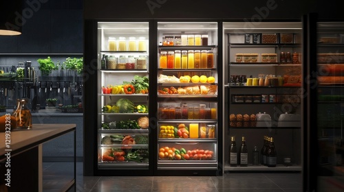 Modern Kitchen with Illuminated Refrigerator showcasing Fresh Produce and Pantry Items