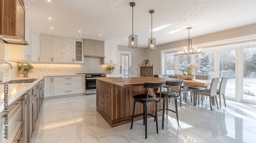Modern Kitchen with Island, White Cabinets, and Marble Flooring