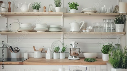 Modern Kitchen with Open Shelving and Fresh Herbs for Stylish Interior Design