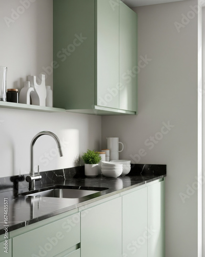 Modern Kitchen with Pastel Green Cabinets and Black Stone Countertop Vertical Portrait