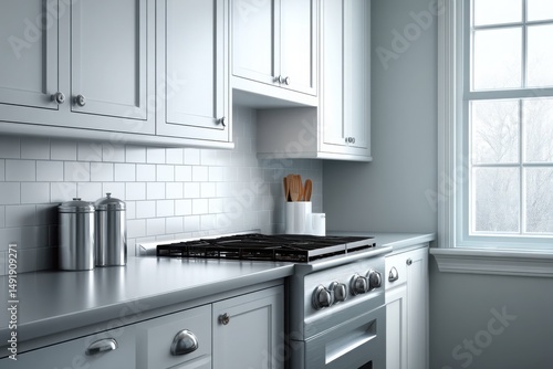 Modern kitchen with sleek design and natural light showcasing a stove and utensils