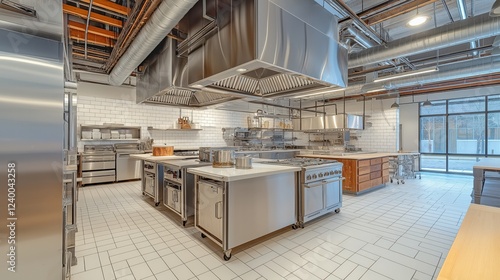 Modern kitchen with stainless steel appliances and industrial-style architecture