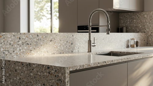 Modern kitchen with terrazzo countertop, sink, and brushed metal faucet.