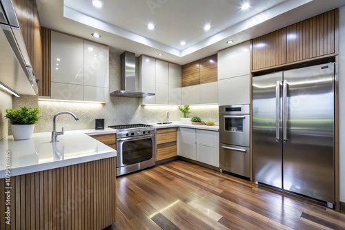 Modern kitchen with tilted angle refrigerator fixed to the wall