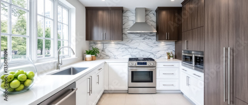 modern kitchen with white and dark wood cabinets stainless steel appliances and marble backsplash