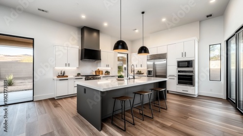 Modern kitchen with white cabinets, black range hood, stainless steel appliances, and large island with seating and pendant lights