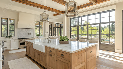 Modern kitchen with wooden island, large windows, and pendant lighting.