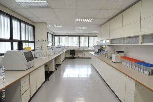 Modern Laboratory Interior Featuring Workstations, Instruments, and Equipment Designed for Scientific Research and Analysis in a Bright and Spacious Environment