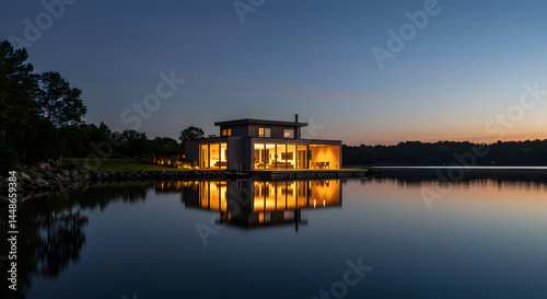 Modern Lake House Reflecting In Calm Water At Twilight Serene Getaway