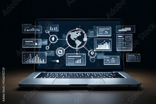 Modern laptop displaying a futuristic holographic interface with global data analytics and social media connections representing digital transformation and business intelligence