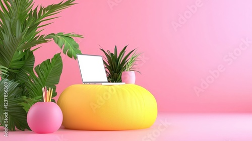 Modern Laptop Workspace Tropical Plants Pink Yellow Minimalist Design