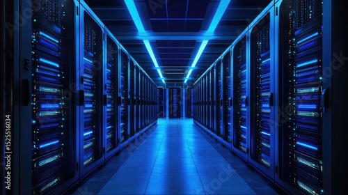 Modern large data center interior with rows of illuminated server racks and blue lighting, ideal for representing cloud technology, cybersecurity, big data, and futuristic IT infrastructure visuals